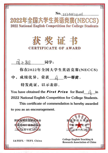 公司科技史硕士点2020级农村科技发展研究生周子翔同学参加的2022年全国老员工英语竞赛(NECCS)获得了A类(研究生)一等奖,并于2023年2月27日拿到获奖证书(见下图)。此赛事每年一届,自1999年创办以来已连续举办二十一届,每年全国共有31个省(自治区、直辖市)的千余所高校的120余万老员工参加。